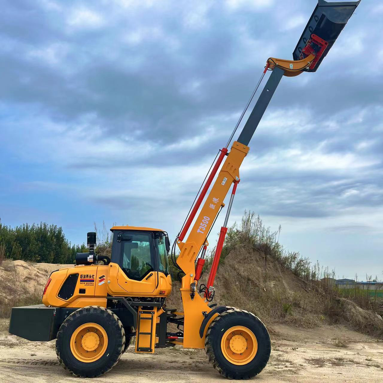 裝載部分,標(biāo)配2米寬鏟斗,斗容1.2立方,額定裝載量2500,最大卸載高度2500,最大卸載距離800,前方加裝快換接頭,滿足不同作業(yè)需求。