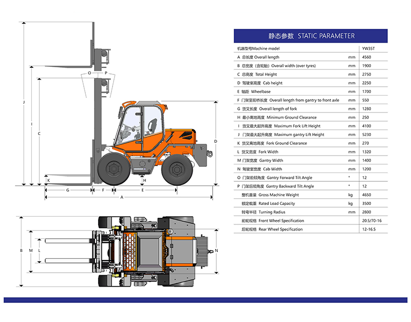 一體式越野叉車(YW35T)為加厚貨叉,精選鋼材提升載重,前輪20.5半實(shí)心輪胎,后輪12-16.5真空鋼絲輪胎,后輪轉(zhuǎn)向,承載 力和脫困能力更強(qiáng),軸距短,一體式車架,無鉸接,轉(zhuǎn)彎半徑小,轉(zhuǎn)向角度大,更適合狹小 空間作業(yè),加裝安全示寬警示燈,保證夜間安全距離作業(yè),發(fā)動機(jī)后機(jī)蓋可向上開啟,更換濾芯更容易,后方擋泥板承載力強(qiáng),可 供保養(yǎng)人員站立。